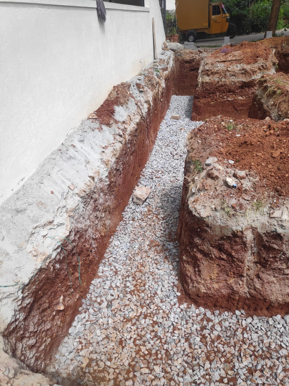 Basement Activity started in traditional way with 3 feet wide Base and tapered to 1 feet at the top. Filled with Boulders, Jelly, and masonry work.