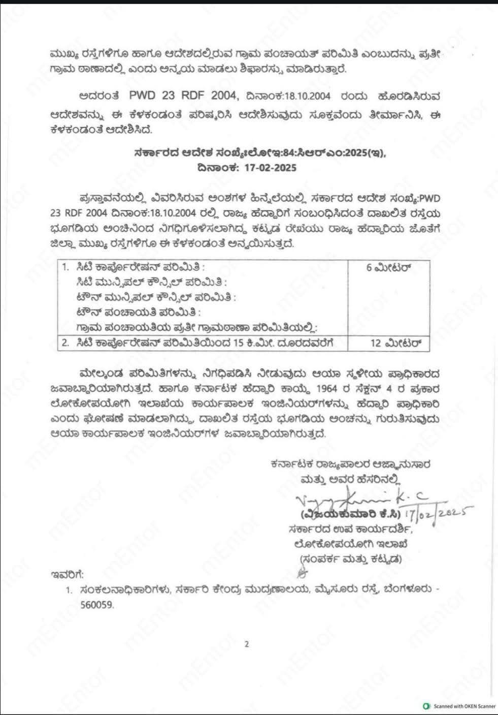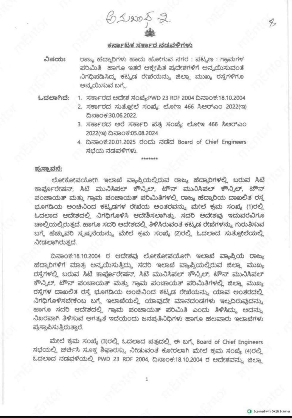 ಜಿಲ್ಲಾ ಮುಖ್ಯ ರಸ್ತೆಗಳ ಪಕ್ಕದಲ್ಲಿ ಮನೆ, ಅಂಗಡಿ, ಯಾವುದೇ ವಾಣಿಜ್ಯ ಕಟ್ಟಡ ಕಟ್ಟುವ ಯೋಚನೆಯಲ್ಲಿದ್ದರೆ, ಕರ್ನಾಟಕ ಸರ್ಕಾರದ ಲೋಕೋಪಯೋಗಿ ಇಲಾಖೆ ಹೊರಡಿಸಿರುವ ಈ ಆದೇಶವನ್ನು ಗಮನಿಸುವುದು ಅತ್ಯಗತ್ಯ. ಇದುವರೆಗೆ ಕೇವಲ 'ರಾಜ್ಯ ಹೆದ್ದಾರಿ'ಗಳಿಗೆ ಮಾತ್ರ ಅನ್ವಯಿಸುತ್ತಿದ್ದ "ಕಟ್ಟಡ ರೇಖೆ" ಅಂತರದ ನಿಯಮವನ್ನು, ಇದೀಗ ಜಿಲ್ಲಾ ಮುಖ್ಯ ರಸ್ತೆಗಳಿಗೂ ಅನ್ವಯವಾಗುವಂತೆ ಸರ್ಕಾರವು ಫೆಬ್ರವರಿ 17, 2025 ರಂದು ಹೊಸ ಆದೇಶವನ್ನು ಹೊರಡಿಸಿದೆ.