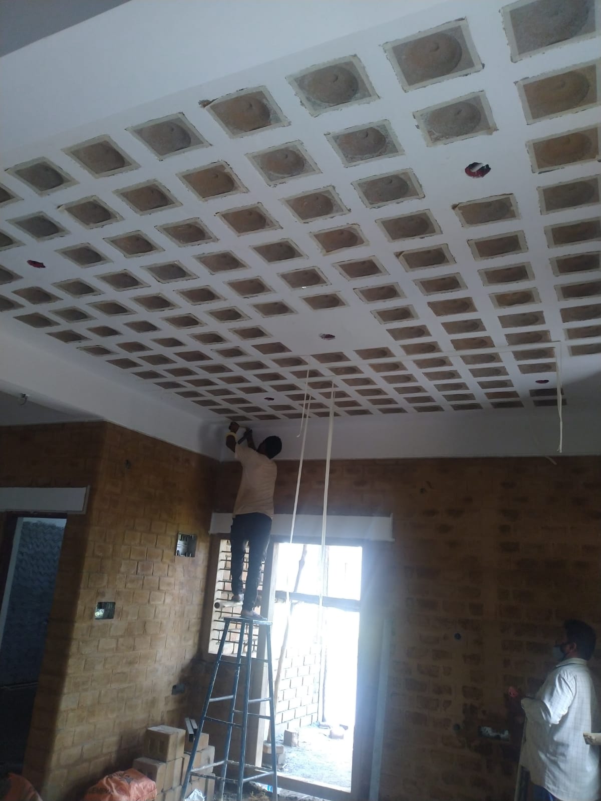 now Ceiling putty & painting work is going. As we have used the CSEB half thickness(2.5" inches) Bricks while making the Filler Slab RCC Molding, we can see a Semi "SPHERE" kind of Shape on the Ceiling. Similarly, many options available for Filler Slab molding like Clay Pots, Mangalore Tiles, Many Different Shaped Clay Tiles, .....etc.