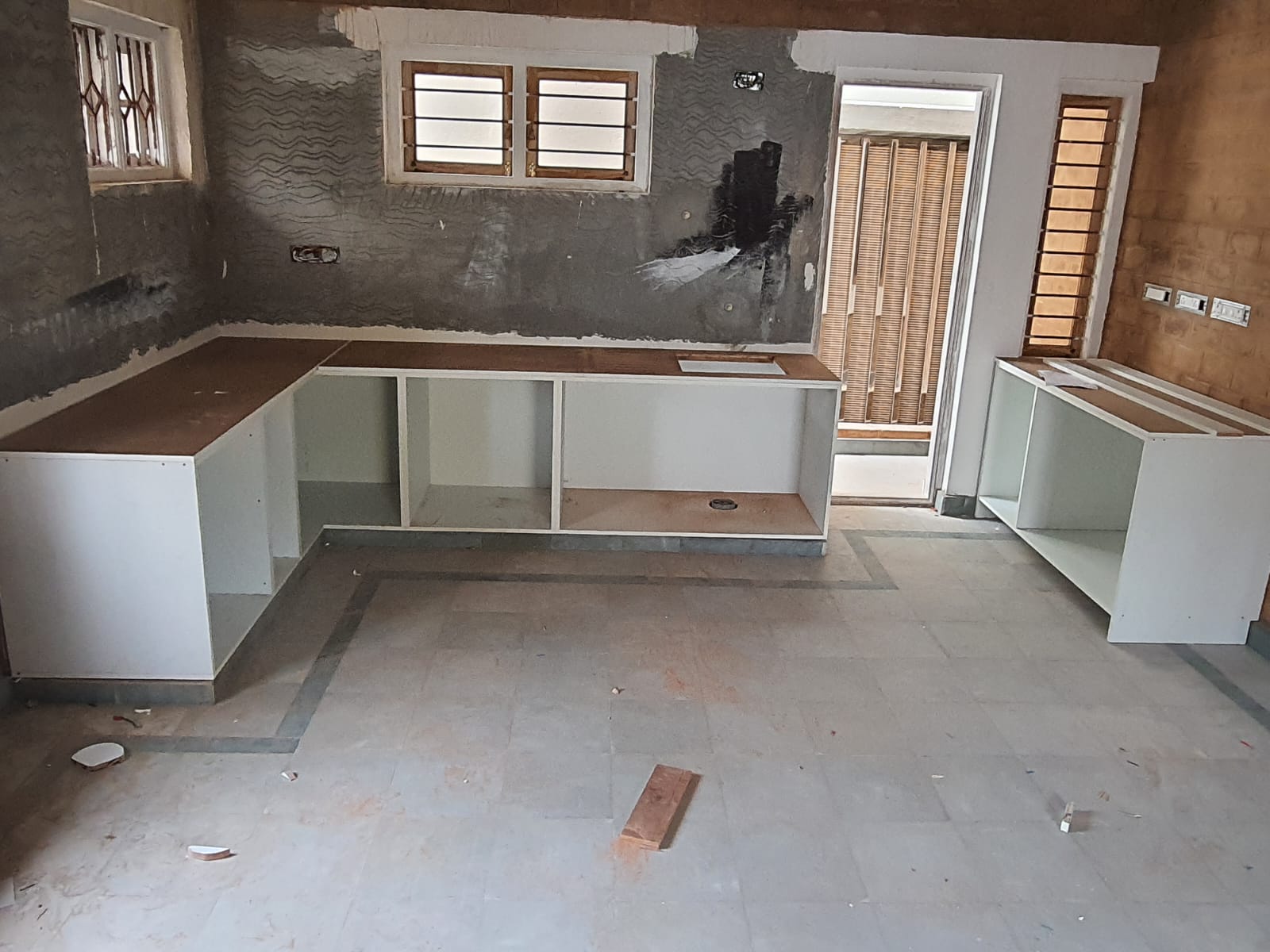 Kitchen Platform, Modular Kitchen Caracas and Dining Counter made of Stone is completed. For the Kitchen Platform as well as the Dining Counter, instead of going for the Kadapa stone or the Quarts, we used the Baroda Green Marble, which is good is color and also having good strength and thin sized one compared to the others which gives Rich look and feel.